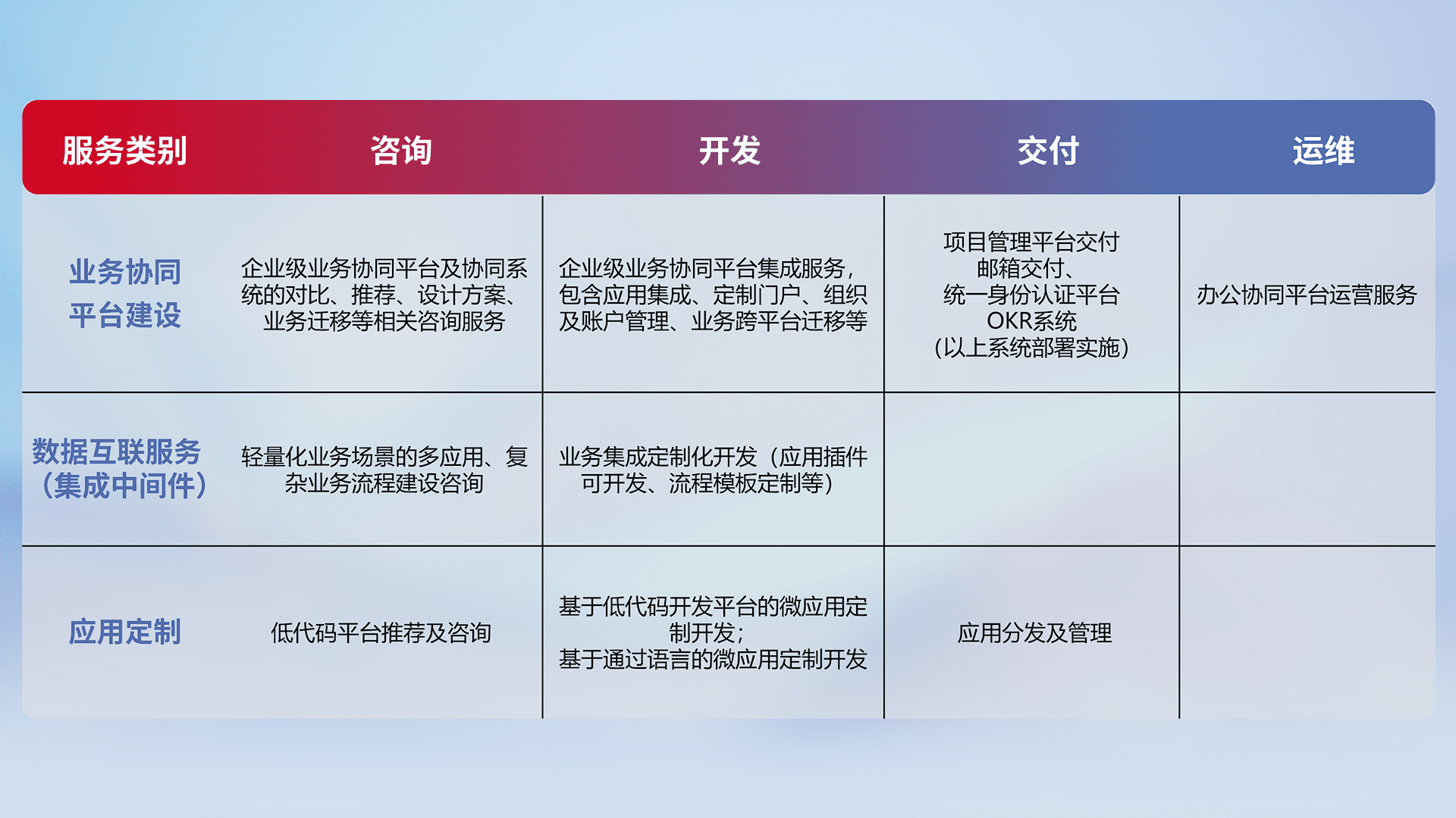 针对钉钉、、、企微、、、、IDaas等平台级产品提供产品的规划、、、、方案、、、、交付、、定制化开发等服务,,实现如统一协同办公、、、、智能客户服务、、、、混合会议管理、、、、智能数据查询、、、、等业务场景,,,,实现数字化转型。。。。