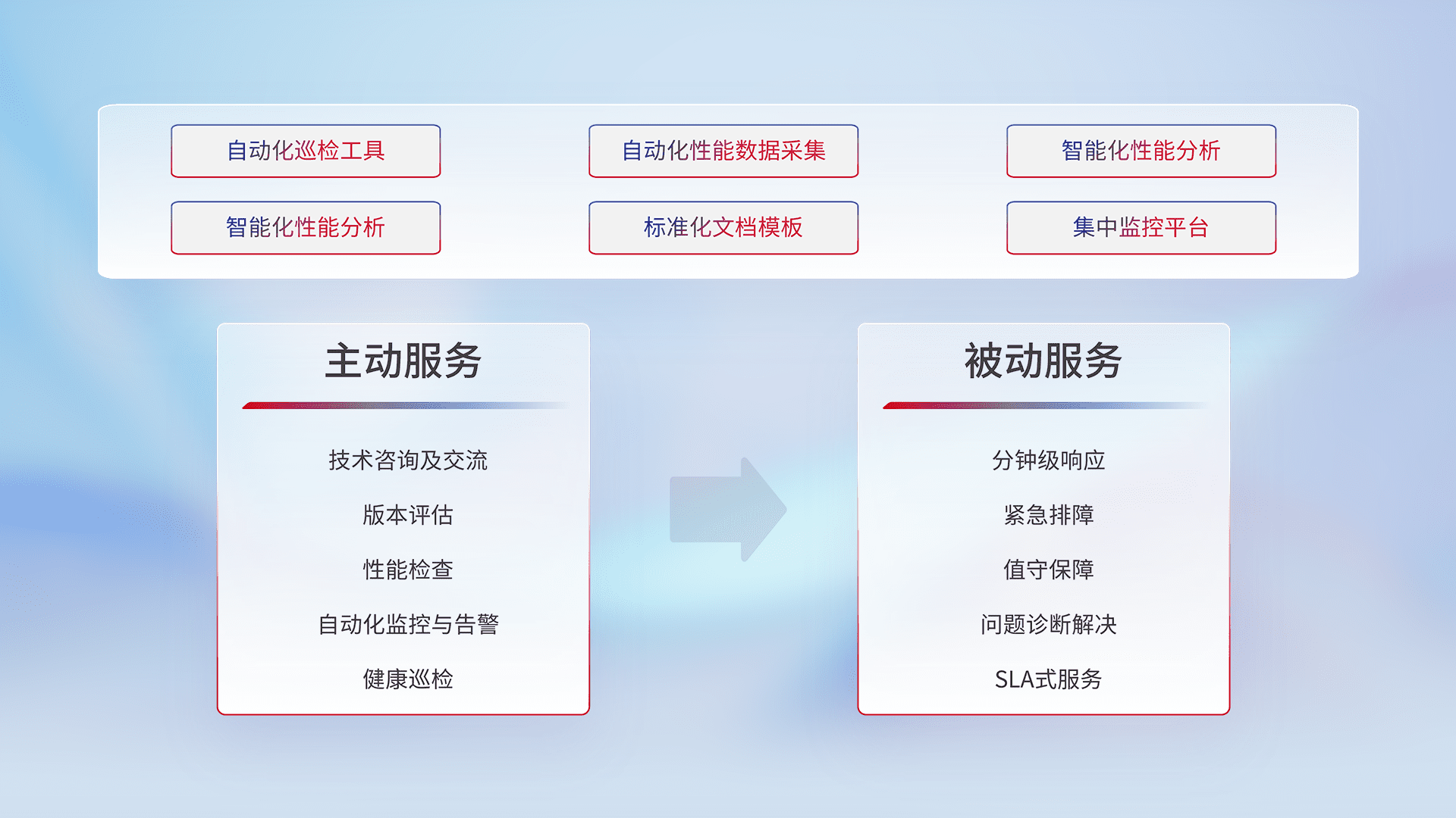智能化工具和标准化文档,,保障服务质量,,,,提供主动服务(包含技术咨询、、、版本评估、、、性能检查、、、自动化监控与告警、、健康巡检)和被动服务包含(分钟级响应、、、、紧急排障、、、、值守保障、、、问题诊断解决、、、、SLA服务)。。。